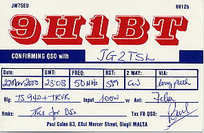 | 2000/3/23 | 08:08 | 9H1BT | 50.115MHz | CW | 559 | 559 | Malta |
