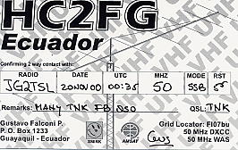 | 2000/11/20 | 09:35 | HC2FG | 50.110MHz | SSB | 55 | 55 | Ecuador |