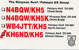 | 2000/10/15 | 10:00 | KH6ND/KH5 | 50.MHz | CW | 599 | 599 | Palmyra & Jarvis Is |