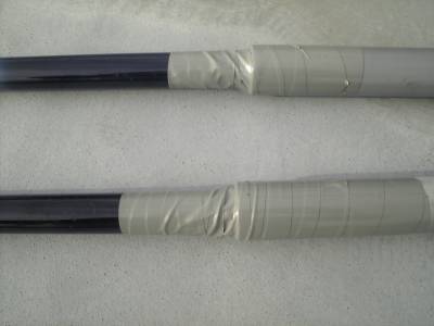 釣竿にヘリカル状にエレメントを巻きつけ、熱収縮チューブで固めました。太い部分は熱収縮チューブで間に合うものがなかったので、ビニールテープぐるぐる巻きです。 上が熱収縮チューブを被せる前。 下が被せた後。 |