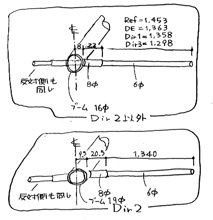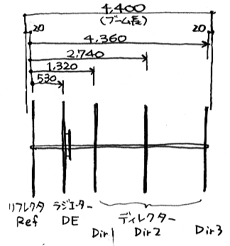 まず、運搬時の長さを1.5mとしたことから、自ずとブーム長が決定されます。ブームを3本継ぎにした場合、1.5x3=4.5。3本のうち、真ん中に当たるパイプを一回り太くし、両側を細くします。すると、ただ差し込むだけで組立ができるので機構的にも簡単です。ただ、重なり部があるので、これを1ケ所辺り5cmと見積もります。最終的なブーム長は4.5-0.01-0.01=4.4mに決定します。実際は、エレメントをブームの端部に固定することができないので、端部からの余裕が必要です。これを20mmずつと見積もると、4.4-0.02-0.02=4.36m。これがRefからDir3までの距離になります。
