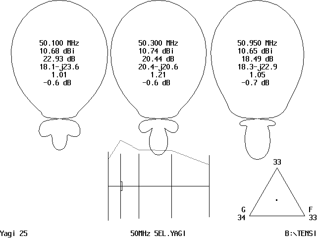 | フロントゲインは少し低めだが、50〜51MHzの1MHzに渡ってSWR<1.5になった。 特に、SSBとRTTYの周波数でSWRが低い。 ビームパターンは比較的きれい。 ちなみに、帯域を少し狭くなるようにラジエーターを調整すると、 50.5MHz付近のSWRはさらに改善される。 |
