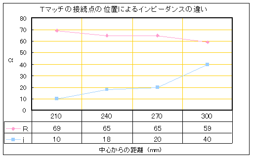 ※Tマッチはフォールデッドダイポールの変形だと思っていたので、「Tマッチの接続点の中心からの距離が大きくなるほど純抵抗が大きくなると思っていたのですが、逆の結果が実験で出てきました。予想外の結果だったのです。