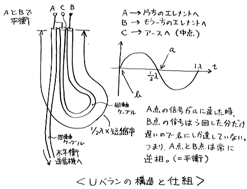 Uバランとは、同軸ケーブルを1/4λ(電気長)の長さにしたものを使用し、逆相を得ることで「平衡−不平衡」の変換を行うものです。市販のアンテナでは、クリエートデザインのベストセラーCL6DXで使用されています。このバランは動作が確実で、製作も容易です。コア等を使わないため、ロスも少なそうです。ただ、インピーダンスが1:4で変換されてしまいます。