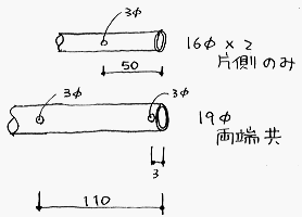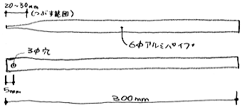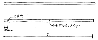 ※アルミパイプは肉厚0.9mm指定です。普通にアルミ材屋に出回っているパイプは肉厚1mmで、このパイプの中に6mmのパイプを入れるのは大変です。肉厚0.9mmのパイプはアルシャン工業、もしくは、ハムショップで購入するのが良いと思います。