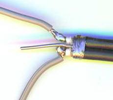 3本の同軸ケーブルの網線部分同士をすずメッキ線(0.6mm)でグルグル巻きにします。あまり強く巻くと、半田付けした時に内部絶縁体がつぶれてしまうので、緩いくらいに巻きます。網線の隙間にすずメッキ線(2mm)を絡めて、半田で固めてしまいます。このすずメッキ線(2mm)はあとでブームに固定して強度を持たせるので丈夫に半田付けします。