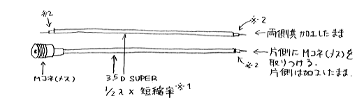 同軸ケーブルの長さで位相差を得るために、なるべく正確に切断する必要があります。僕は下記の調整方法によって、(1/2λx短縮率)の長さを得ました。3.5D-SUPERでの製作では、2,320mmでした。