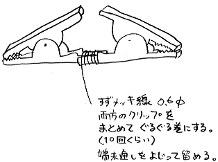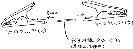 2つのワニ口クリップ(大)を使用して作ります。この方法は多くの方が試されていると思います。特徴としては、接続部分の強度を上げるためにすずメッキ線を使用していることでしょうか。欠点は、元々ワニ口クリップが屋内使用を想定して製造されている為、しばらくすると錆びてしまうことでしょうか。