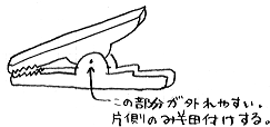 なお、クリップの軸になっている棒と、クリップ本体が接続されているリベットの部分を軽く半田付けしておくと、あとでクリップが破損しにくくなります。半田を流し過ぎると、クリップが開かなくなってしまいますので、手早く作業して、半田が広がらないようにしないといけませんが・・・。