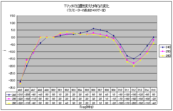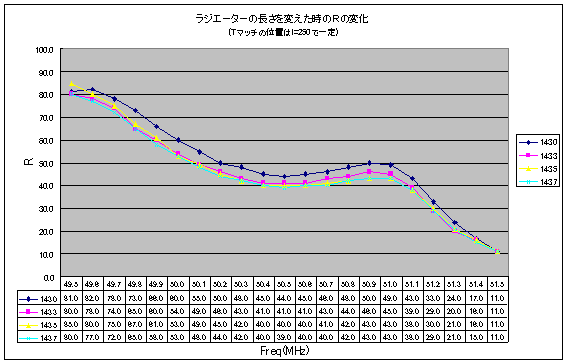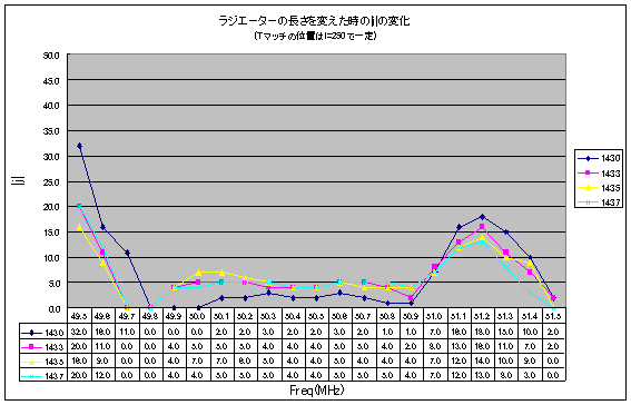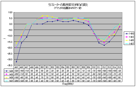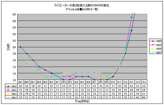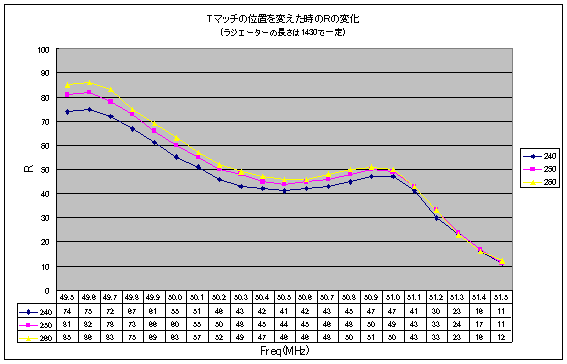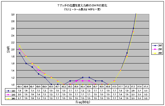 まずは、Tマッチの位置を一定にしたまま、エレメントの長さを少しずつ変えた時のSWRの変化を見てみます。