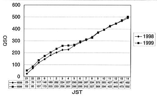 始めに「スタートダッシュ、局数重視で行こう」と考えた作戦は、最後まで尾を引いて、結局、マルチを減らすことになったようです。局数も500は超えたものの、実質的には昨年とあまり変わらないし。(増えた分は、ローカルの組織票の分だけという話もある。)それにしても、グラフにすると寝過ごした影響が目立つなぁ。