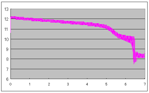 | 24AHのバッテリーにFT-790mkU+FL-7020+ダミーロードを接続して、FMモードで 10秒受信10秒送信を繰り返す。30秒ごとにバッテリーの電圧をロガーに記録する。 それを集計してグラフにしたのが上記のものです。縦軸が電圧、横軸が時間。 つまり、6時間ほどしかバッテリーが持ちません。 ここには載せませんが、FT−290+FL-2010だとこれよりもはるかにバッテリーが持つので、 430MHzだといかに効率が悪いか分かりました。 いずれにしても、24AHのバッテリーではコンテストを戦えません。 |