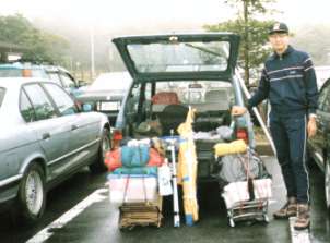 | LTAの車の後ろにまとめた荷物群 背負子の荷物の重さは左右どちらも約30kgでした。 |
