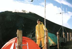 辺りはすっかり明るくなり、霧もない。富士山の山肌がくっきりと見える。遠くから登山者の声が聞こえてくる。障害物がないと遠くの声も良くきこえてくるものなのですね。ここ宝永山にも登山者が来るようになった。一般の登山者に質問されるのも少しわずらわしいなと思い、家で作ってきた「ただいま、アマチュア無線の競技会に参加中です。」という張り紙をテントに張った。