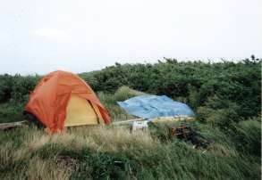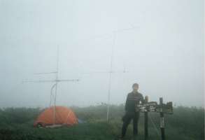 3回目の担ぎ上げも無事終了しましたが、山頂はまだまだ風が強く、設営するのもためらってしまいます。アンテナはどうしようもないので、とりあえずテントを張ることにしました。しかし、風が強くてテントが言うことを聞いてくれません。風に飛ばされそうなんです。でも、どうにかこうにかテントを設営しました。目を離したすきに飛んで行ってしまいそうなので、とりあえず荷物をガサゴソ入れてしまいました。ペグを打ったら結構安定したけど、それでも、かなり風に揺られていました。
