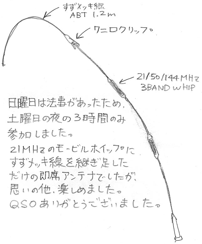 そこで「14MHzキット」を急遽作りました。2mほどのすずメッキ線の先にワニ口クリップを半田付けするだけです。作業時間が10分くらい。でも、当然調整していないので、調整がうまく行かなかったら今日買ったばかりのホイップで7MHzで出ても良いし、コンディションが良ければ21MHzでも良いかな。結局、どのバンドに出るのかも考えないまま自宅を出発しました。もう20時になりそうです。コンテストまであと1時間。