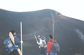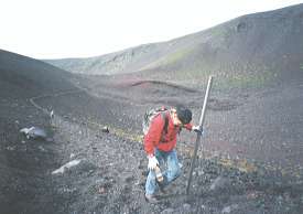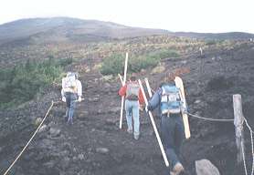 宝永火口での休憩のあと、その急な坂を登り始めます。これが苦しいのなんのって。火山岩を砕いた砂利のような中を進むのですが、足を地面に付けると、地面の中に足が埋まっていくような感じ。1歩進むと、半歩くらいは後ろに下がってしまい、ちっとも前に進みません。だんだんと要領をつかんできて、少しは前に進むようになりますが、それにしてもこれは苦行です。